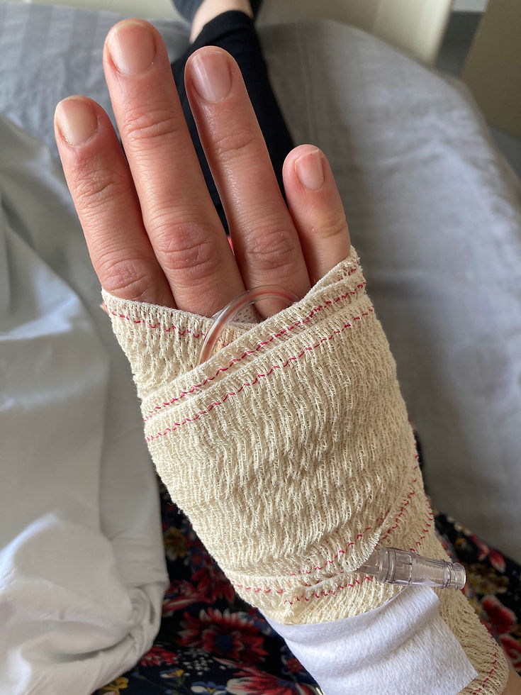 Dat het infuus op een heel onpraktische plaats hing (rechterhand, vlak onder de buitenste knokkels), moest ik erbij nemen.