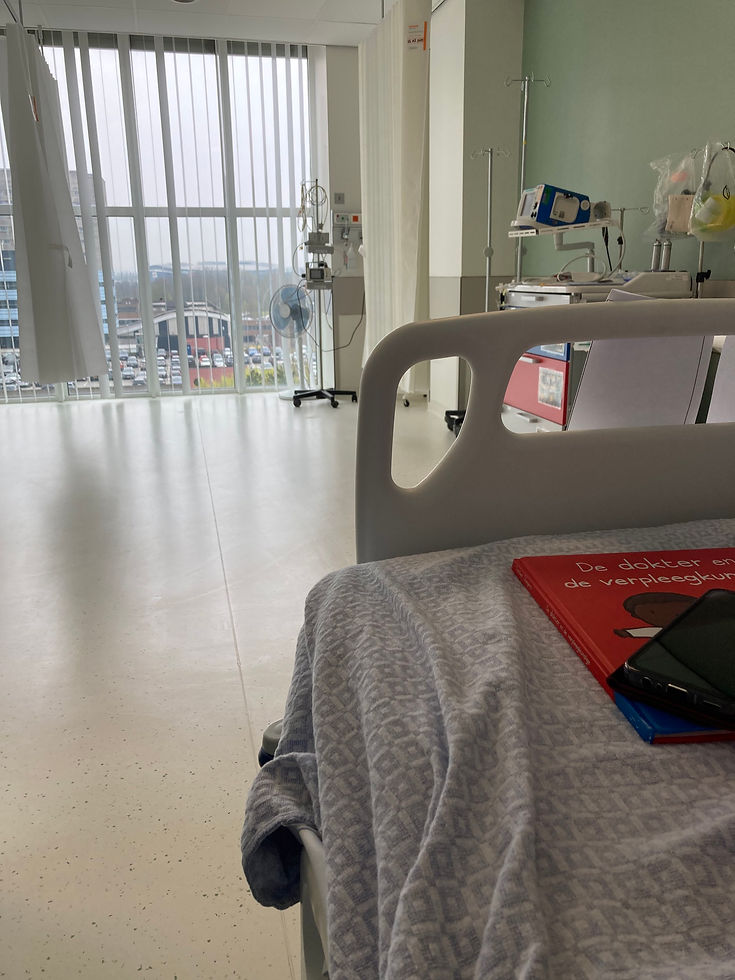 De vrijwilligster arriveert en rolt Noor-Aline door de campusader naar het operatiekwartier.